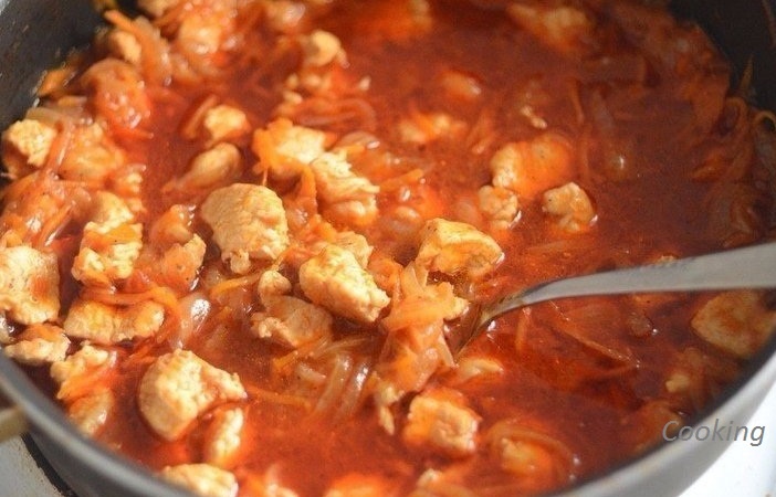 Соль, перец- по вкусу Нарезаем не большими кусочками куриное филе. Выкладываем на разогретую сковороду и слегка обжариваем на растительном масле. К мясу добавляем натертую на терке морковь, мелко нарезанный лук и чеснок. Перемешиваем и обжариваем около 5-7 минут. Убавляем огонь.
