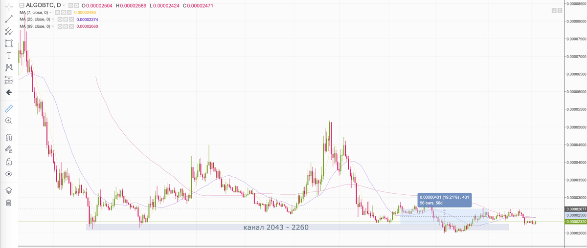 Обещал описать стратегию, по которой делал вход. В интернете есть достаточно статей описание стратегии Pump&Dump, когда после взрывного роста мусорных акций происходит такой же быстрый откат, и вместе с медведями мы можем хорошо заработать те кто поверил в компанию. Дамп и Памп работает наоборот. Актив резко падает до того уровня где находится покупатель. Этот уровень должен подтверждён историческими минимума и объёмами торгов на этих периодах. Это работает хорошо на чисто спотовых рынках - то есть без заёмных средств и кредитных плечей. Дойдя до уровня проторговки (накопления объёмов) происходит переломная ситуация - актив продавцов переходит в руки покупаетелей лимитными ордерами. В следсвии чего мы и видим эти уровни. Посмотрим на пару #ALGOBTC которую я купил аж 4 мая по цене 2280 (я опускаю нули чтобы проще читать) Цена на истории видно что билась аж 4 раза, когда я покупал цена билась аж в уровень 2000. Ожидания были конечно до 3000, доходили до 2700. Но увидим что народ не заин