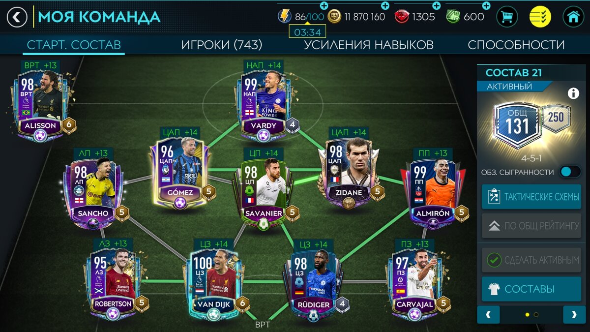 В этом посте я хочу рассказать о своём составе. Рейтинг состава 131/250. Нап- Джэйми Варди 99 ТОТС. Удары очень сильные, вне штрафной кладет спокойно. Скорость не плохая. С угловых забивает часто, удар с головы как у Роналду УТОТС. Контроль мяча, дриблинг соответствует стартам. Цена его на данный момент 11 миллионов. Левый ЦАП- Гомез УТОТС. Сильный удар, хороший контроль мяча, дриблинг на высоте. Есть и минусы, Самый главный это его второй финт радуга. Иногда она не получается, не знаю из-за чего. А главный плюс это его усиление навыка- второй нап, потому что можно сократить количество навыков в вашем составе. Правый ЦАП- Зидан Прайм-кумир. Плюсы: неплохой удар в штрафной, дриблинг, контроль мяча и сыгранность со всеми игроками т.к это кумир. Минусы: Штрафной удар- бьёт очень плохо хотя по статам складывается другое впечатление. Если он как я написал выше, в штрафно