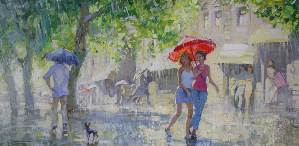 И вдруг запрыгал по листьям, по траве по дорожке дождь, крупный, громкий. Дождь все привел в движение: с визгом бросились под крышу малыши, застучали каблучки по мостовой. Машины, окропленные дождем, пришли в движение. Замелькали яркие зонтики. Но разве от такого потока воды можно скрыться?