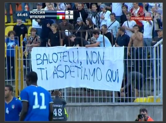 По дороге на стадион из окна автобуса Балотелли мог наблюдать растянутый на деревьях баннер на английском языке: "Марио, даже не думай об этом!", а во втором тайме на решетке одного из секторов стадиона "Петровский" был вывешен более понятный для футболиста текст, уже на итальянском: "Балотелли, тебя здесь не ждут".