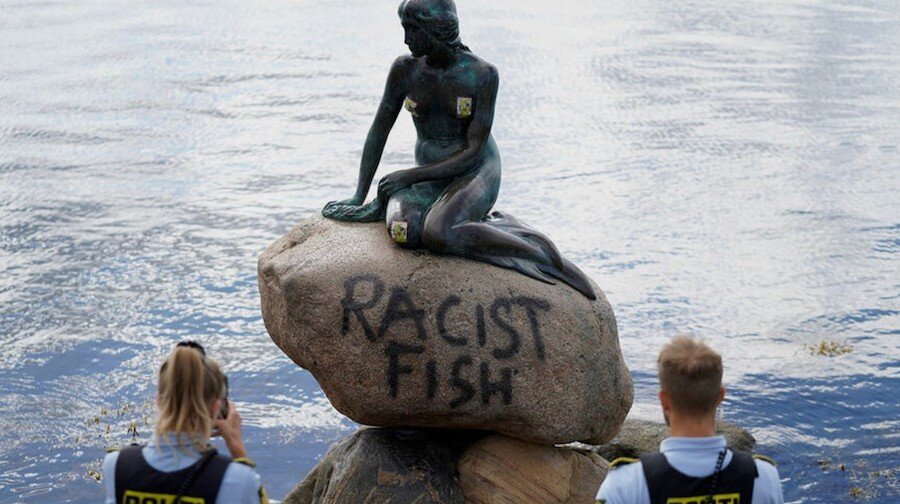 В Дании несчастный памятник андерсеновской Русалочке в очередной раз осквернили. То её краской обливали, то паранджу надевали, то голову ей отпиливали, теперь написали, что она «расистская рыба». То есть понятно, что дебилоид, который это сделал, умеет писать. Зачем ему это, никто не объяснил. Что он делает в Дании, тоже. Ему не нравится тамошний климат? Памятники? Сказки Андерсена? Или вообще, всё, что его окружает? А зачем тогда там жить? И почему бы в Европе и Америке не открыть сезон охоты на варваров?