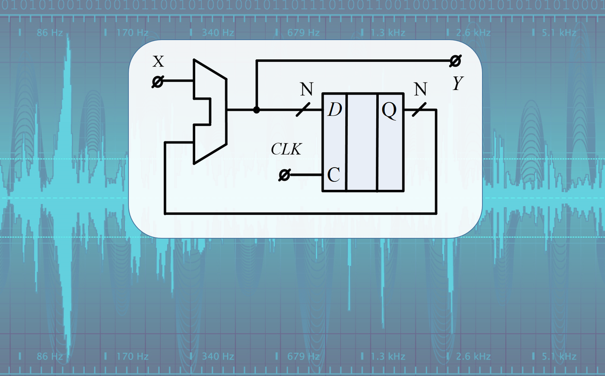 Реализуем интегратор на языке Verilog. В его описании нет абсолютно ничего сложного. Один сумматор, который мы рассматривали в одном из прошлых выпусков, а также регистр из триггеров для хранения числа (суммы предыдущих отсчетов). В этом случае на выход поступает сигнал с сумматора.