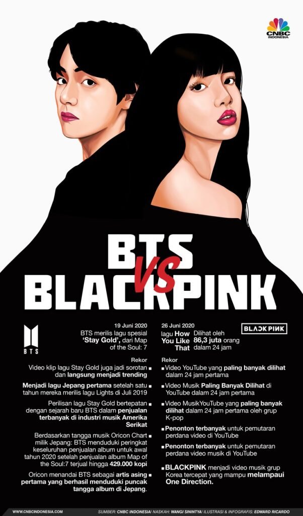 Индонезийское СМИ Jakarta, CNBC в прямом эфире устроило битву между двумя популярными к-поп группами. Девчонки из коллектива BLACKPINK соревновались с парнями из BTS. Ведущие сравнивали их достижения, чтобы определить, кто же все-таки лучший. BTS 19 июня 2020 года группа BTS выпустила специальную песню «Stay Gold» из альбома «Map of the Soul: 7». Видеоклип на трек сразу же стал популярным и занял первую позицию с японской песней после выпуска трека Lights в июле 2019 года. Как сообщает Oricon Chart, BTS заняли первое место по продажам альбомов в начале 2020 года. Было продано 429 000 копий. BTS — первая южнокорейская к-поп группа, которая успешно ворвалась в чарты альбомов в Японии. BLACKPINK 26 июня 2020 года девчонки из BLACKPINK поделились новым синглом и клипом «How You Like That». За первые сутки видеоролик набрал 86,3 млн просмотров, установив три мировых рекорда: «видео с наибольшим количеством просмотров на YouTube в течение 24 часов», «музыкальный клип с наибольшим количество