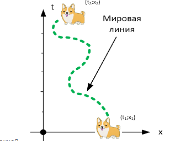 Последовательности событий, происходящих с песиком на диаграмме Минковского сопоставляется непрерывная линия, называемая мировой линией песика. Точки этой линии определяют координаты песика во все моменты времени. Если, например, песик стоит на месте, то его мировая линия на диаграмме Минковского представляет собой прямую перпендикулярную оси Х. Если песик движется с постоянной скоростью, то его мировая линия представляет собой линейную функцию – тоже прямая. Если песик движется неравномерно, то мировая линия будет искривлена.