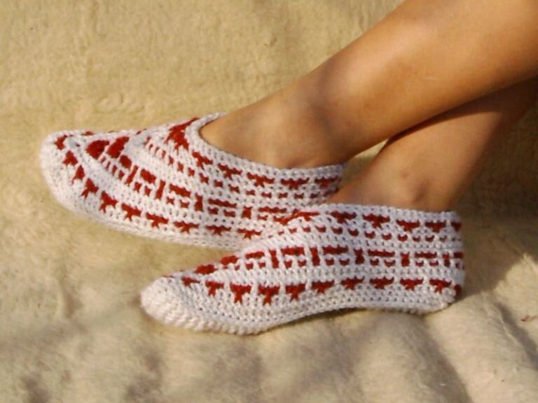 Такие тапочки больше напоминают следочки. Выполняться они могут в разных техниках. Некоторые рукодельницы мастерят их из отдельных вязаных квадратов. Далее они соединяются. Такие тапочки больше напоминают пэчворк.