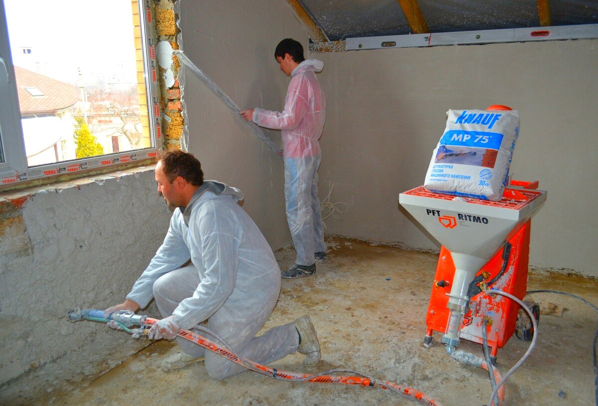 Технологический процесс машинной штукатурки довольно прост. Перед работой необходимо произвести подготовку поверхности, чаще всего грунтуют. Следующим этапом необходимо произвести выставления маяков, после подготовки поверхности приступают к подготовке машины. Для этого в устройство засыпают сухую смесь ну и добавляют необходимое кол