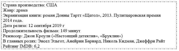 1. «Щегол» / «The Goldfinch», 2019. Фильм о молодом человеке – Теодоре Деккере, который в 13 лет потерял маму. Она погибла при взрыве в Метрополитен-музее в Нью-Йорке. Сам Тео чудом остался жив, и вынес из музея очень ценную картину Карела Фабрициуса «Щегол», с целью спасти её от пожара. В течение всей юности он и картина будут неразлучны, и она сыграет большую роль в происходящих с молодым человеком событиях. Нам покажут, как не просто сложилось жизнь мальчика после потери матери: воссоединение с отцом, переезд на другой конец страны, из Нью-Йорка в Лас-Вегас, знакомство с соседским пареньком Борисом, их дружба, злоупотребление алкоголем и запрещенными веществами, бегство обратно в Нью-Йорк через всю страну, взросление, любовь, предательство, потеря смысла жизни и обретение его вновь. На мой взгляд, этот фильм, пример идеальной экранизации: и в плане соответствия тексту первоисточника, и в плане подбора актеров и создания фильма в целом. Невероятно красивый фильм о сложной жизни мал