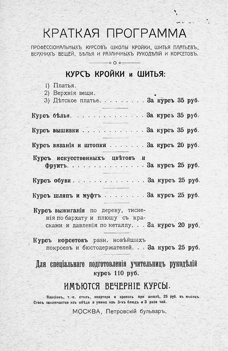И в 1912-м году существовали курсы кройки и шитья. Время бежит, а какие-то навыки продолжают быть очень актуальными. Курсы были дневными и вечерними, с пансионом и без. Судя по ценнику, спрос на пошив был разный. Обучение шитью одежды, в том числе верхней и детской стоило 35 рублей. Столько же стоил курс вышивки. Научиться делать обувь, корсеты, шляпы и муфты, искусственные цветы и фрукты можно было за 25 рублей. Курсы вязания и штопки, выжигания по дереву, тиснения по бархату и плюшу с красками, давления по металлу (чеканка?) обходились в 20 рублей.