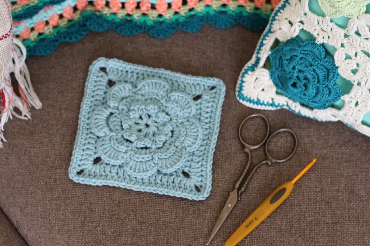 Сегодня у меня вот такой цветочный квадратик. Очень красивый и объемный. Схема Рэйчел. Вокруг кольца делаем 8 лепесточков из комбинации "столбик-две цепочки-столбик". Следующий ряд делаем тоже их столбиков и цепочек по схеме. Теперь вяжем простые цепочки как бы сзади. На цепочках формируем лепестки из столбиков с накидом по схеме. И снова цепочки сзади. И снова лепестки. Сзади снова цепочки. На цепочках формируем квадрат. И столбики с накидом по периметру. На последнем ряду по 19 столбиков с каждой стороны и по 3 столбика в каждом углу. Спасибо, что зашли в гости и дочитали до конца! :)