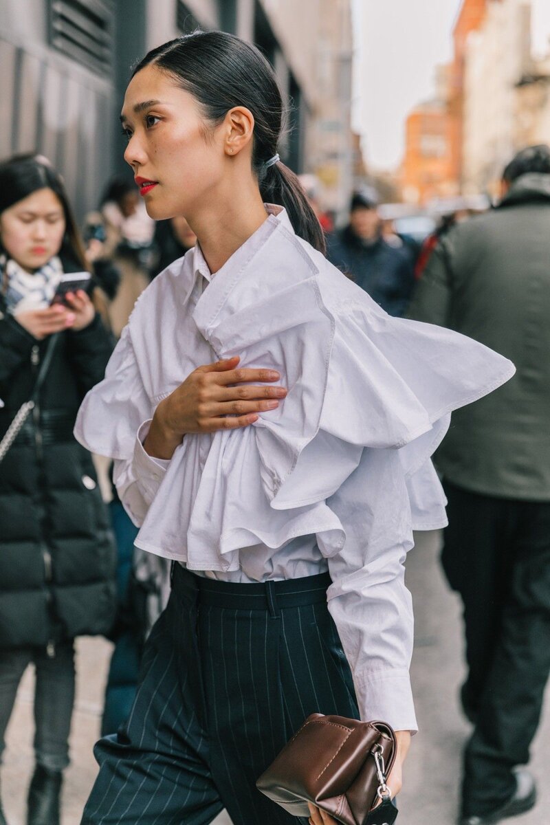 Бывает так, что грудь маленькая и плечи узкие, поэтому визуально сверху не хватает объема. Такая фигура называется груша или треугольник, когда бедра визуально тянут все тело вниз. В таком случае вы можете делать акцент на верхней части туловища с помощью блуз с оборками и воланами. Выглядят они очень романтично, модно и эта функция для девушек с грудью большой недоступна.