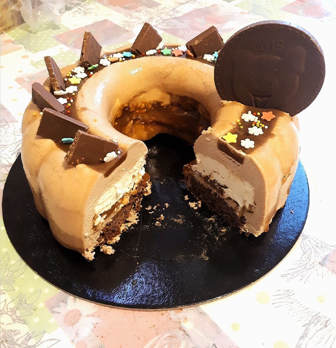 На дно формы вылить небольшое количество шоколадного мусса. Далее подморозить в морозилке. Затем выкладываем карамельную начинку, доливаем мусс и сверху выкладываем бисквит. Торт оставить в морозилке на всю ночь. С утра достать торт из формы и украсить по желанию. Можно покрыть его зеркальной глазурью.