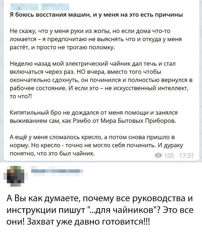 Это уже 9 часть смешных картинок на моем канале. Предыдущие статьи можете посмотреть кликнув на - Обезьянку 🙈 Мне определенно нужен такой чайник ;D Да и многим из вас, я думаю, что он не помешал бы. Это один из лучших отзывов что я читал в своей жизни :D Примерно такая медицина у нас в Молдове :D ( Шутка ) Мама скинула дочке попить... :D А что если и в правду кто то открыл шкатулка и все это не случайность? ( Надеюсь вы смотрели Джуманджи и поймете этот мем :) ) Еще 1 топовый отзыв ;D Выкрутился мужик, красава. --- На этом все. Рад что вы прочитали до конца. Счастье вам и вашим близким. Спасибо за лайки.