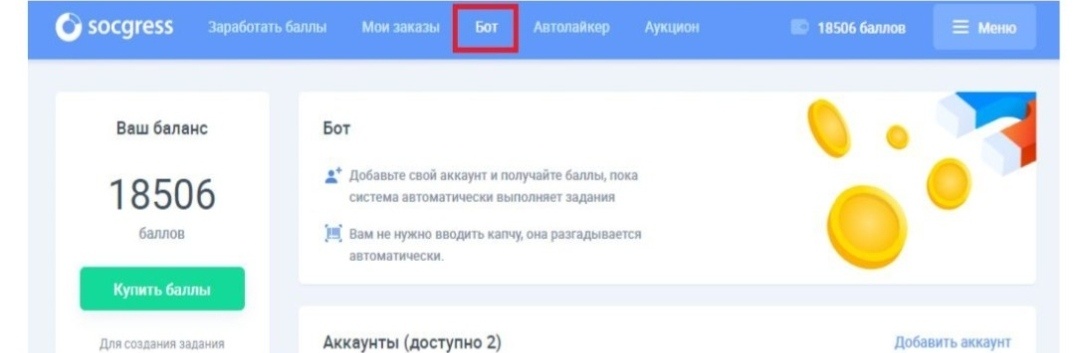 Привет, друзья! Сейчас я вам расскажу как можно зарабатывать Кворке очень приличные деньги, причем приложив не так уж много усилий в 2020 году. Если конкретнее - то мы будем кворкать всеми любимый Инстаграм. Интересно? Погнали! Эта статья написана только для образовательных целей. Автор не публиковал эту статью для вредоносных целей. Если читатели хотели бы воспользоваться информацией для личной выгоды, то автор не несёт ответственность за любой причиненный вред или ущерб. Введение Существуют сайты для накрутки показателей для социальных сетей, а именно: Instagram, Одноклассники, Вконтакте и YouTube. А есть сайт для продажи услуг по накрутке этих показателей. Вопрос в том, где брать ресурс для накрутки, и как продвинуть вашу услугу чтобы её покупали. Подготовка ресурса Для начала зарегистрируйтесь на сайте для накрутки https://socgress.com, а затем зайдите на вкладку "Бот": Этот бот работает в режиме онлайн. Тут можно добавлять до 30-ти аккаунтов и каждый из них будет автоматически
