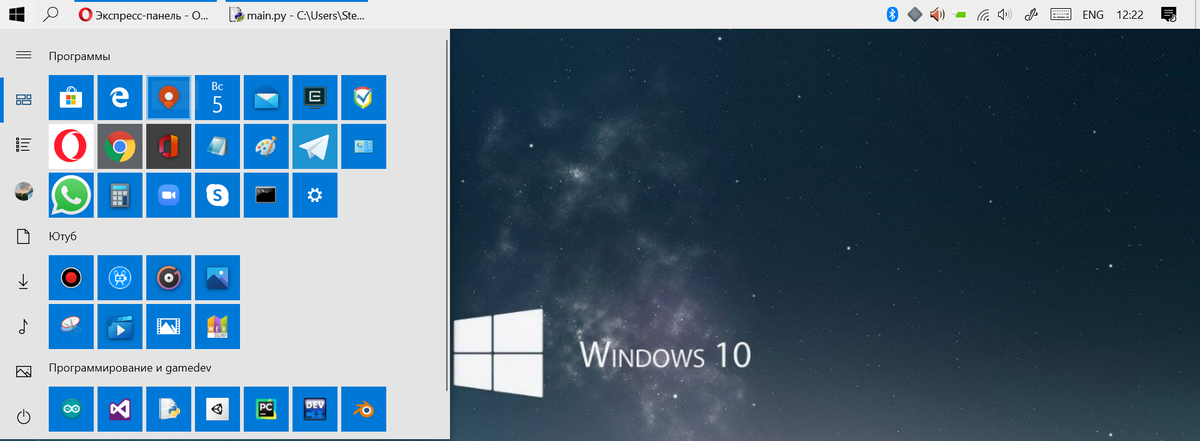 Все действия я производил на компьютере под Windows 10, версия 1909. Проверить версию Windows можно так: нажимаете "Win + R", вводите "winver", нажимаете "OK". Рабочий стол У многих на рабочем столе ярлыки программ. Их надо убрать. Ярлыки только засоряют рабочий стол. Эти ярлыки мы перенесём в меню пуск, но это чуть позже. Теперь обои. Скачайте себе красивые обои, которые вам нравятся. Меню "пуск" Переходим в параметры, персонализация, "пуск". Предлагаю вам настроить это так как у меня на скриншоте. В принципе вы можете указать открывать "Пуск" в полноэкранном режиме(как в Windows 8.1), но это на ваше усмотрение.