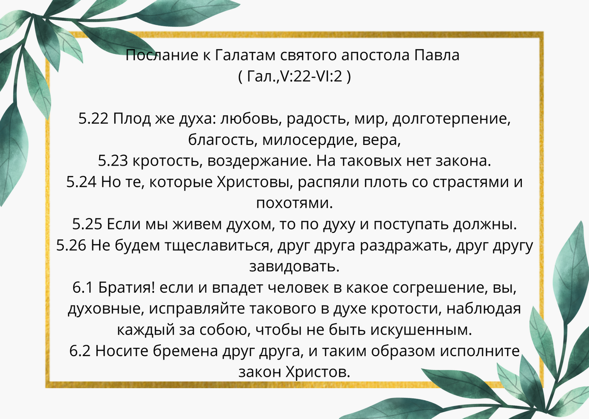 В одной из предыдущих записей я говорила о том, что прежде чем искать призвание, важно обрести внутренний мир. Да и вообще, это основа любого дела. И задачка эта не из простых. Сегодняшнее апостольское чтение, говорит, что это плод духа. Получается, что мир - это результат нашей духовной жизни, нашего стремления, нашей внутренней работы. В этой же главе Послания Апостола Павла читаем : "Ибо во Христе Иисусе не имеет силы ни обрезание, ни необрезание, но вера, действующая любовью" (Галатам 5:6). Апостол расшифровывает нам, что значит быть от духа. Бабушка супруга всегда желает нам мир в душе. Однажды она пояснила, что мир в душе - это когда ты со Христом. Для меня это и есть ответ. А о том, как быть со Христом всё Евангелие и все Послания. Вот и у Владыки Антония Сурожского читаем об этом: "Смирение, если говорить о русском слове, начинается с момента, когда мы вступаем в состояние внутреннего мира: мира с Богом, мира с совестью и мира с теми людьми, чей суд отображает Божий суд