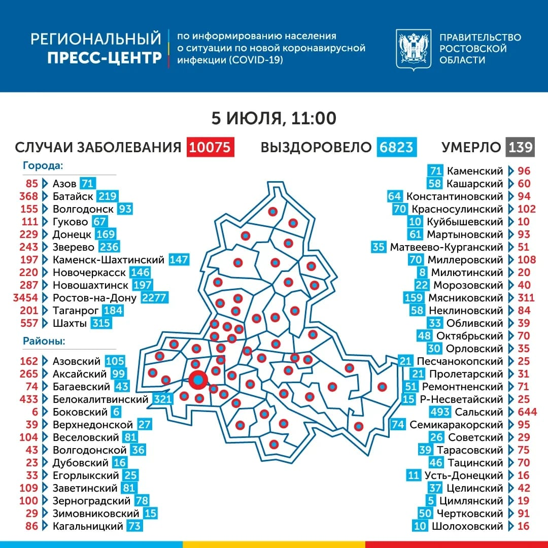 Коронавирусом в Ростовской области заразились больше 10 тысяч человек. Об этом сообщает региональное правительство, ссылаясь на данные Роспотребнадзора. За минувшие сутки тестирование выявило вирус ещё у 93 жителей области, общее число заболевших достигло 10075. Коэффициент распространения инфекции – 0,93. Новые инфицированные зарегистрированы в 20 городах и районах региона. Больше всего в Ростове-на-Дону (49) и Шахтах (9). Увеличилось также количество умерших от COVID-19, их стало 139 человек. За последние 24 часа умерли еще двое. В больницах Ростовской области сейчас находятся 630 пациентов. В тяжёлом состоянии на аппаратах ИВЛ – 33 человека. Вчера директор программы ВОЗ по чрезвычайным ситуациям Майкл Райан высказал предположение, что второй волны коронавируса может не быть.