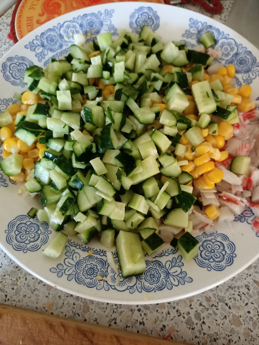 - В глубоком салатнике смешать кукурузу, рис, нарезанные палочки, огурцы, яйца. Посолить, заправить майонезом непосредственно перед тем, как подать к столу, посыпать нарубленной зеленью.