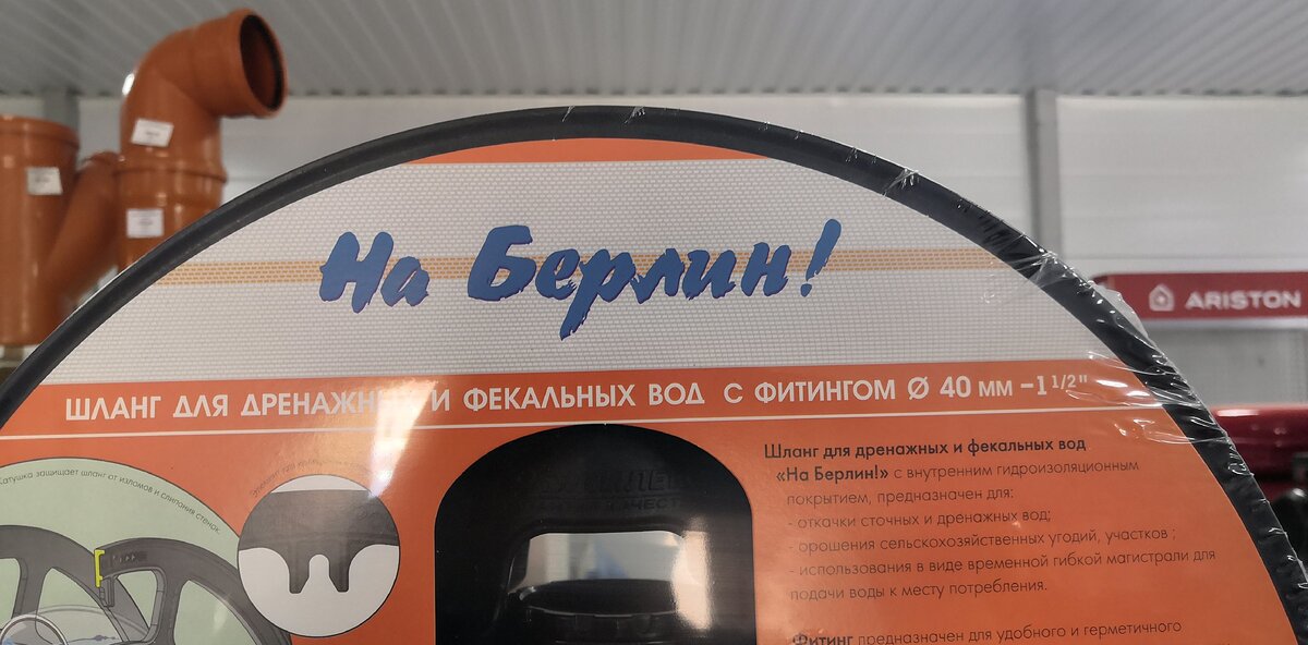 Что имели ввиду производители шланга для дренажных и фекальных вод назвав его "На Берлин!" ? У меня в голову не приходит ровным счётом ничего, кроме как что они предполагают залить дренажными и фекальными водами город Берлин. Видимо это так. Я вначале даже не поверил, что это так шланг называется, но информация на упаковке справа развеяла мои сомнения))))) Поскольку это шланг предполагается использовать для откачивания дренажных и фекальных вод, то его название говорит о том, куда эти воды надо сливать. Стоит этот шедевр маркетинга вполне сносно)))) Но я всё равно недоумеваю - зачем надо было так назвать шланг для дерьма!?!?!? В чём тайна маркетинга? Как Вы думаете? Спасибо за просмотр! И всем здоровья!!!!!
