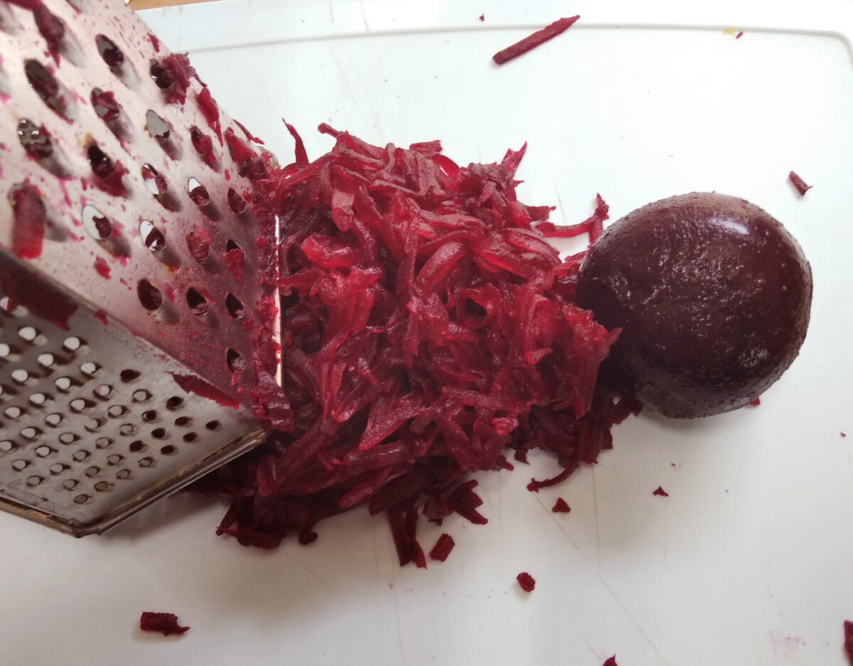 1. Отвариваем, охлаждаем и очищаем свеклу. Натираем её на крупной тёрке.