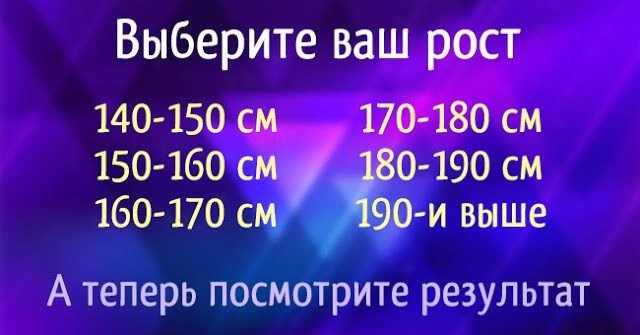 О человеке можно многое рассказать, глядя на его руки, глаза, губы, ногти и даже рост. Сегодня рассказ пойдёт о том, какие особенности характера присущи людям в зависимости от роста. 140–150 см Вы любите помечтать. Но это вам на руку: все ваши мечты благополучно претворяются в жизнь. Вы любите проводить время наедине с собой, обдумывая свои взгляды и планы. Вы интроверт, шумные и большие компании вам чужды. Вы хорошо сходитесь с людьми, которые похожи на вас. Ни к чему не относитесь поверхностно, все делаете тщательно. Никогда не пойдете на поводу у других, всегда рассмотрите проблему с точки зрения морали. 150–160 см Вы не похожи на других. У вас хорошо развита интуиция, окружающие считают вас чудаковатым. Многие вас не понимают, и это сильно вас ранит. Вы нуждаетесь в личном пространстве и не терпите, когда нарушают ваши границы. Вы творческая личность и всегда стремитесь улучшать свои навыки. Вы очень эмоциональный человек. Хорошо разбираетесь в людях и видите их сильные и слабы