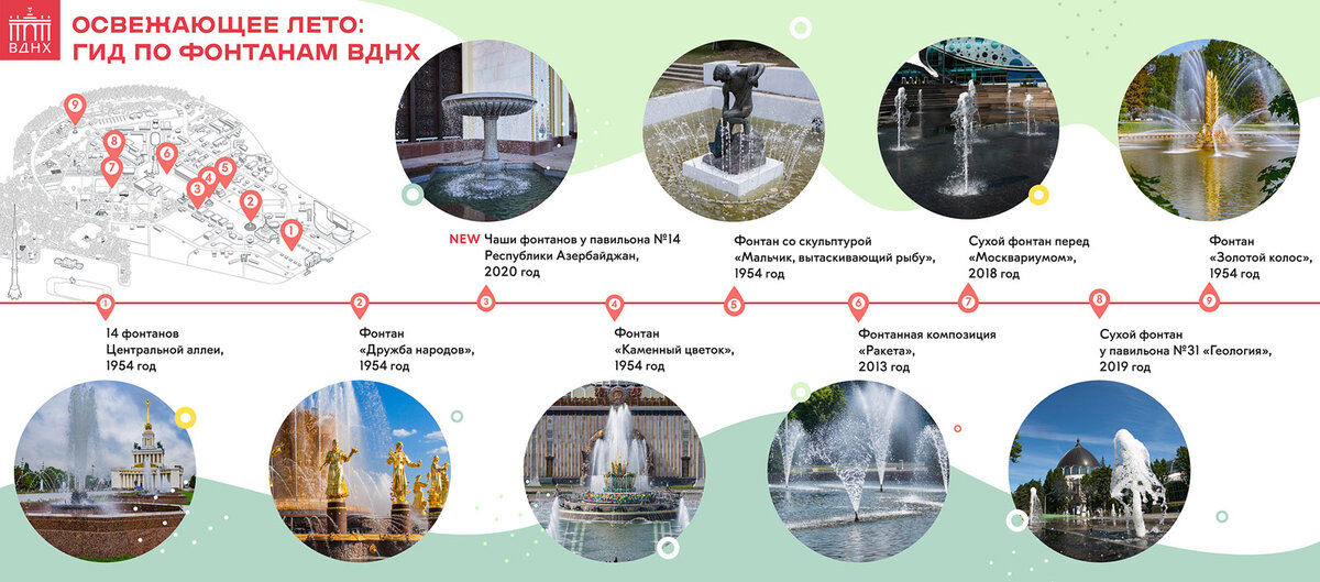 Впервые в истории Главной выставки страны на ВДНХ появился путеводитель по фонтанам. В гид, подготовленный пресс-службой ВДНХ, вошли не только символы Москвы «Дружба народов», «Каменный цветок», «Золотой колос», но и малые фонтаны Выставки, менее известные широкой публике. Гид-путеводитель поможет познакомиться с ними, а освежающая прогулка по территории в жаркий летний день — отдохнуть и отвлечься от городской суеты.