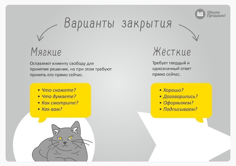 В чем суть закрытия? Оно реально повышает количество согласий. Огромное количество людей не против приобрести то, что вы продаете: просто им никто не предлагает. Самое главное — закрытие гарантирует моментальную обратную связь. Получая обратную связь, вы можете не думать за клиента, а просто выбрать свое следующее действие.
