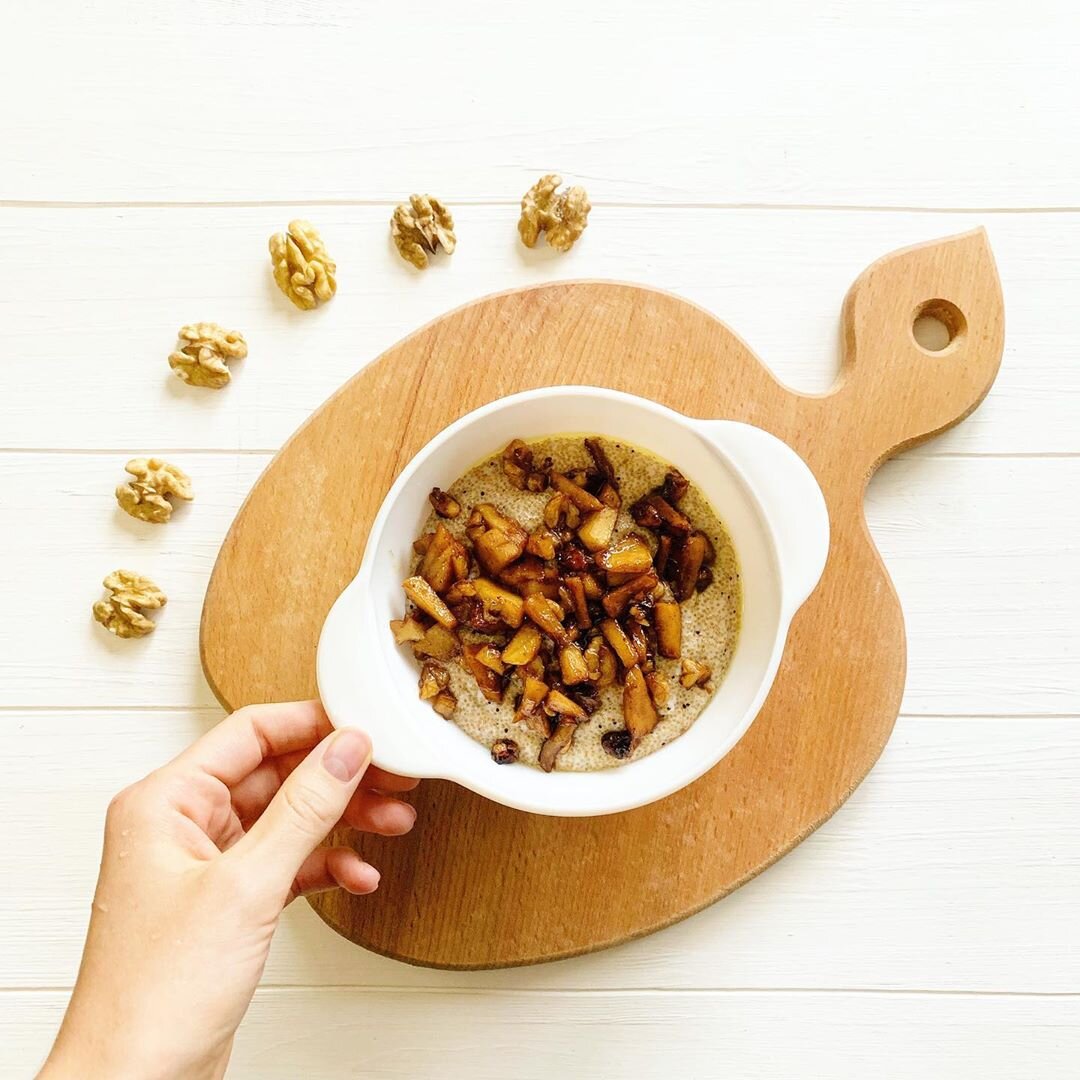 3. В готовую кашу добавить кокосовое молоко, варить ещё пару минут. При подаче украсить карамелизированными яблоками с орехами.