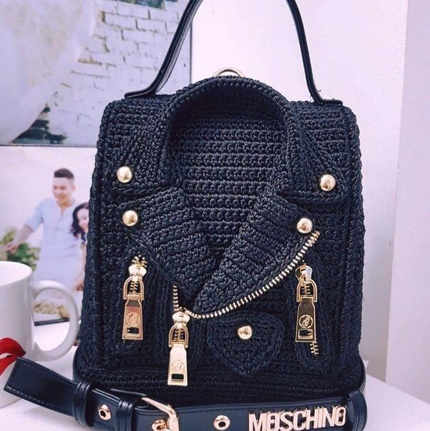 Судя по лейблам - это полёт фантазии от модного дома MOSCHINO. Правда на официальном сайте компании не нашла вязаных образцов изделия. Там только кожа... да ткань.