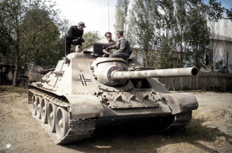 Поэтому, в сборнике «Третий Рейх во Второй мировой войне» есть большое количество всяких разных не самых проверенных от немцев историй, одна из которых переносит нас в лето 1944 года. Когда немецкие танкисты в составе группы армий «Центр» сдерживали натиск русских в Белоруссии. Тогда некто немецких танкист Генри Штайнмайер воевал на среднем танке Т-3, который был уничтожен практически сразу, и его экипажу выдали советскую трофейную САУ СУ-85, лишь бы как-то заткнуть потери. При этом, наносить опознавательные знаки пришлось вручную.