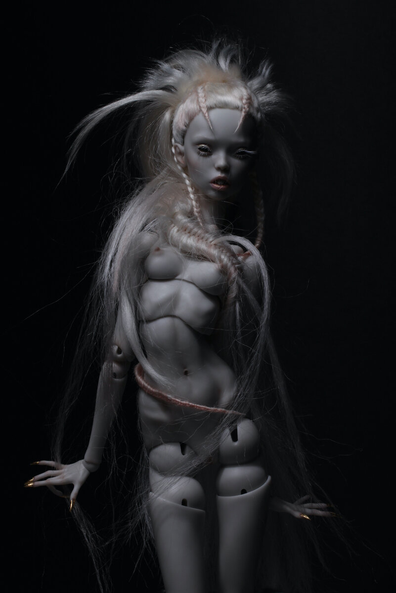 Am I looking at this doll or is it looking at me? The Sisters Popovy masterfully summon the Da Nice Time Kid, Yolandi Visser of Die Antwood, from polymer and porcelain. More Madonna than Matryoshka, this doll exudes an aura of haunting haute. Her handcrafted hair floats around her shoulders, accentuating a near fetishistic attention to form. Do not look away, you risk missing this sculpture drift in signature Popovy ball-jointed style to the next pose. Deconstruction of the traditionally static form of this doll would have been enough to render it a mainstay of modern art. However, it is when one discovers the Sisters have created an enigmatic form in celebration of growth that the true implication of the Movement is realized. This doll works to subvert traditional form to the very core.What was once an exemplar of what women were told to be has been evolved into a higher form. This doll wields beauty while celebrating imperfection, contrasting porcelain beauty with intentionally impe