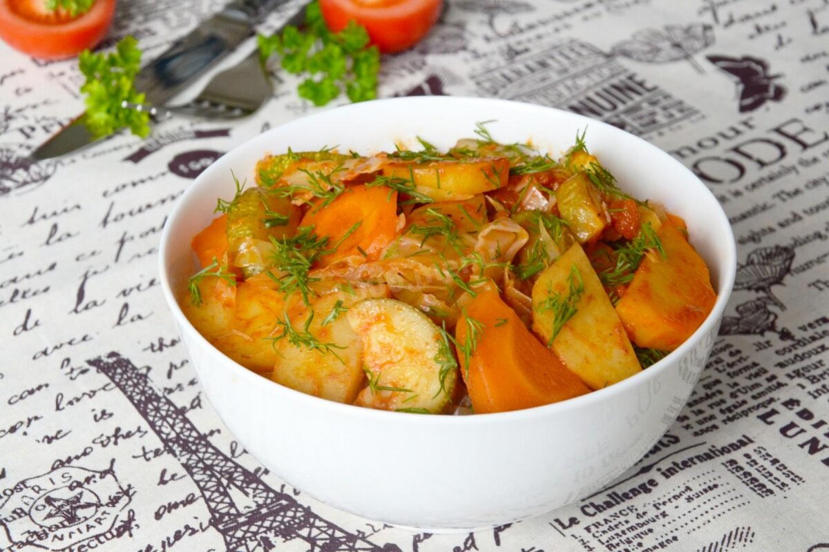 Овощное рагу с кабачками и капустой - вкусно, полезно, дешево и сердито! Набор продуктов доступный и недорогой. Процесс готовки самый простой. Такая еда питательная, ароматная, в дополнении не нуждается. Подавать можно на обед или ужин. Ваши домашние будут просить добавки!