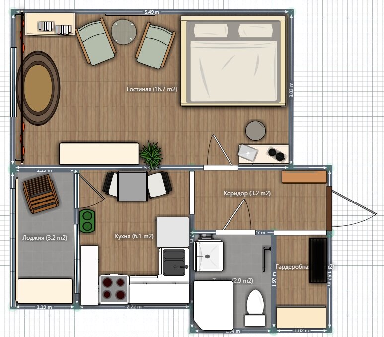 Первая планировка для обсуждений готова. Проект делала в программе Planer 5D, в ее бесплатной версии. Как это выглядит в работе покажу в конце статьи.