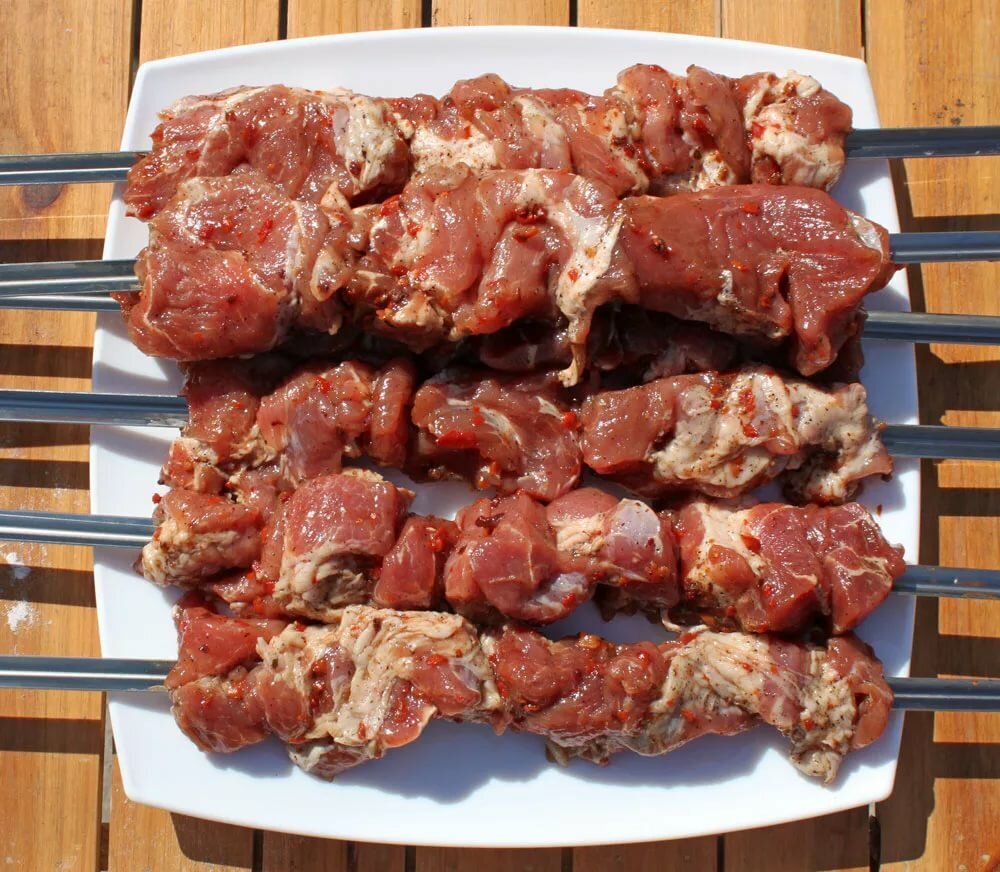 - После маринования нанизать на металлические шампуры. Готовить шашлык классическим способом – на мангале или в духовом шкафу. При необходимости – слегка досолить.