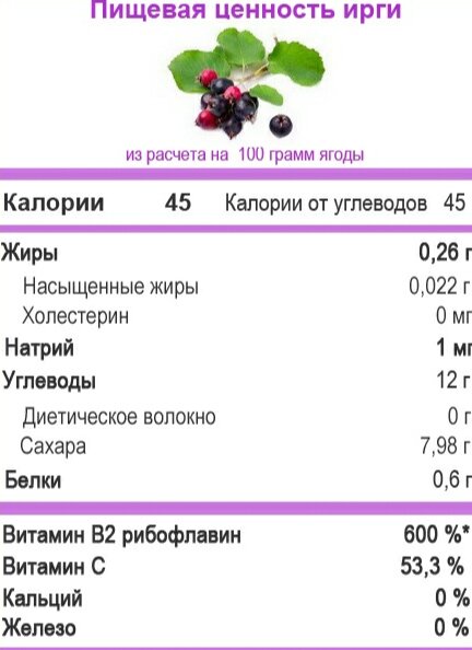 Калорийность ирги Это низкокалорийная ягода, в 100 г которой содержится 45 кКал. Однако из-за повышенного содержания углеводов ею не стоит злоупотреблять людям, страдающим ожирением. Полезные свойства ирги Ирга содержат до 12% сахаров, яблочную и другие органические кислоты, дубильные и красящие вещества, флавонолы, витамины P, C, группы В, каротин, микроэлементы, клетчатку, пектины; в семенах содержится жирное масло, а в коре и листьях - дубильные вещества. Ирга превосходят даже виноград по содержанию витамина «С», а также богаты каротином, витамином «Р», сахарами и другими минеральными веществами. У людей, употребляющих иргу, улучшается сон, зрение и работа кишечника. Сок из свежесобранных плодов ирги почти не отжимается После 7-10-дневного хранения слоем не более 5 см можно отжать до 70% сока. Учитывая, что ягоды имеют пресно-сладкий вкус и не богаты органическими кислотами, в продукты переработки добавляют лимонную кислоту или натуральный сок кислых плодов.