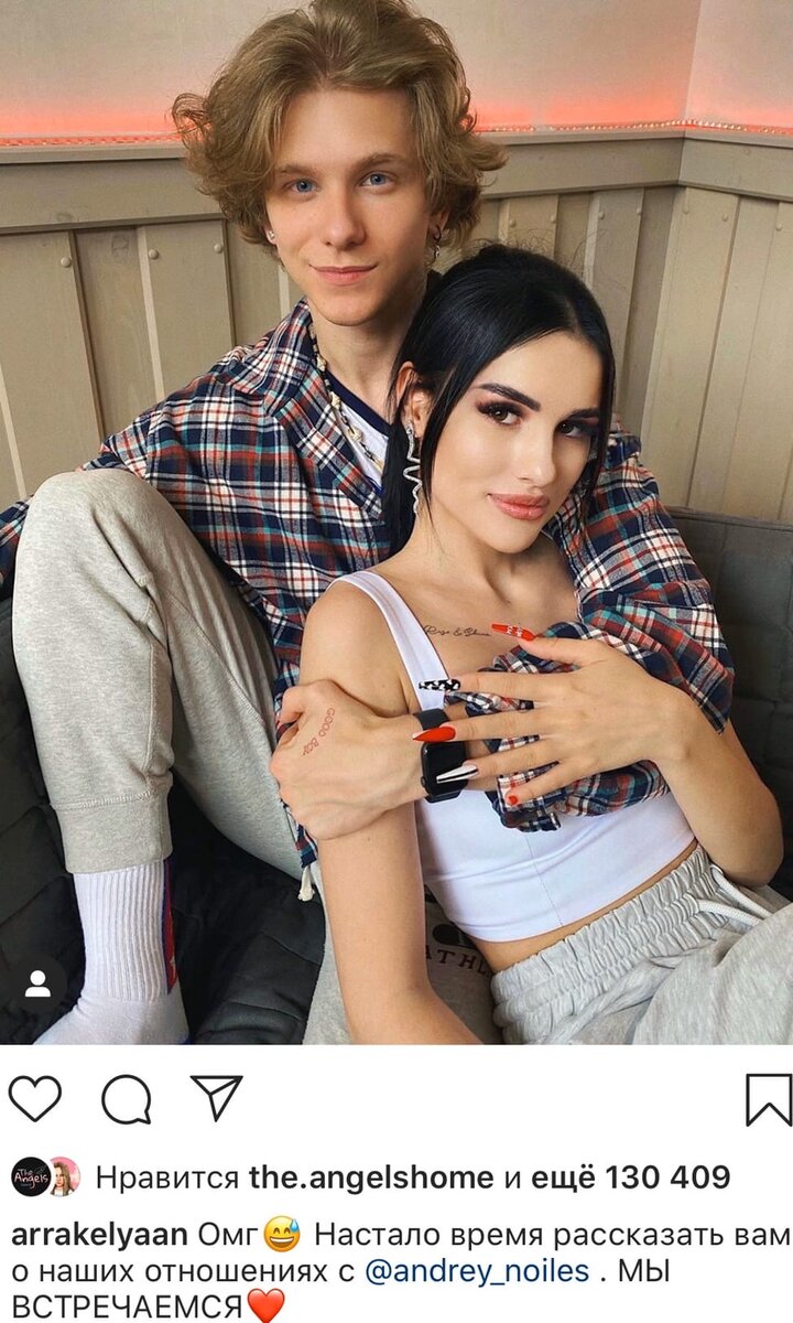 Карина Аракелян и Андрей Ноилс официально встречаются. Бывший избраник Карины, тоже Андрей. Совпадение? не думаю Позже ВПШ опубликовали запись: Ребята подтвердили свои отношения. Они познакомились на общих тусовках, а первое свидание было в ЦУМе Андрей состоит в Just Team House, а Карина в Angels Home Нравится пара?)