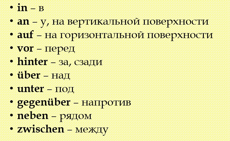 Все предлоги: 1. an, 2. in, 3. hinter, 4. neben, 5. zwischen, 6. auf, 7. vor, 8. über, 9. unter, 10. gegenüber.
