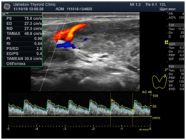 (I draw attention to the fact that in no manuals and articles on thyroid ultrasound (except from our Clinic) the authors do not report anything about the nature of the “vascularization” change, because they use the erroneous old (hundred years ago) distorted conclusion about the alleged absence of the influence of the nervous system on the thyroid gland, which contradicts the laws of nature. Increased blood flow can be seen to varying degrees with euthyroidism, hypothyroidism and hyperthyroidism. This is not explained by colleagues. It is only fixed.).