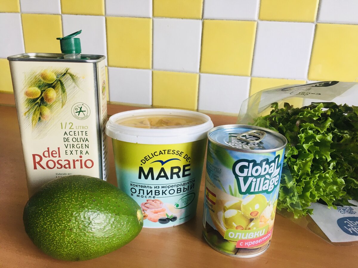 Для салата я приготовила: морской коктейль, оливки, салат фризе, авокадо. В Испании разные модификации салата - чаще всего, плюсом идет:
