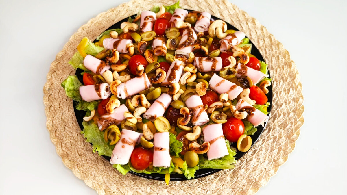 Всем большой привет! ❤️️❤️️❤️️ Сегодня предлагаю вам приготовить очень вкусный и изысканный Салат СУДАРЬ. В конце этого поста я разместила подробный видео рецепт. Буду очень рада, если он Вам понравится! 🥬Свиной карбонад - 12 ломтиков. 🥬Творожный сыр с зеленью - 100г. 🥬Помидоры черри - 100г. 🥬Болгарский перец средний - 1 шт. 🥬Оливки - 1 банка. 🥬Листья салата. 🥬Жареные орехи кешью - 100 гр. Заправка: 🥬Оливковое масло - 3 ст. л. 🥬Дижонская горчица - 1 ч.л. 🥬Бальзамический соус - 2 ч.л. 🥬Сок лимона - 2 ст. л. 🥬Мед - 1 ч. л. 🥬Соль, сухой чеснок, черный перец по вкусу ✅ 1. Готовим заправку. В небольшую глубокую емкость добавляем растительное масло, лимонный сок, соль, сухой чеснок, черный молотый перец, бальзамический соус. ✅ 2. Добавляем дижонскую горчицу и мед. Все тщательно перемешиваем. Ароматная заправка готова. ✅ 3. Из тонкопорезанного карбоната формируем рулетики, начиняя их творожным сыром. ✅ 4. Разрезаем рулетики на две части. ✅ 5. На большое плоское блюдо вык