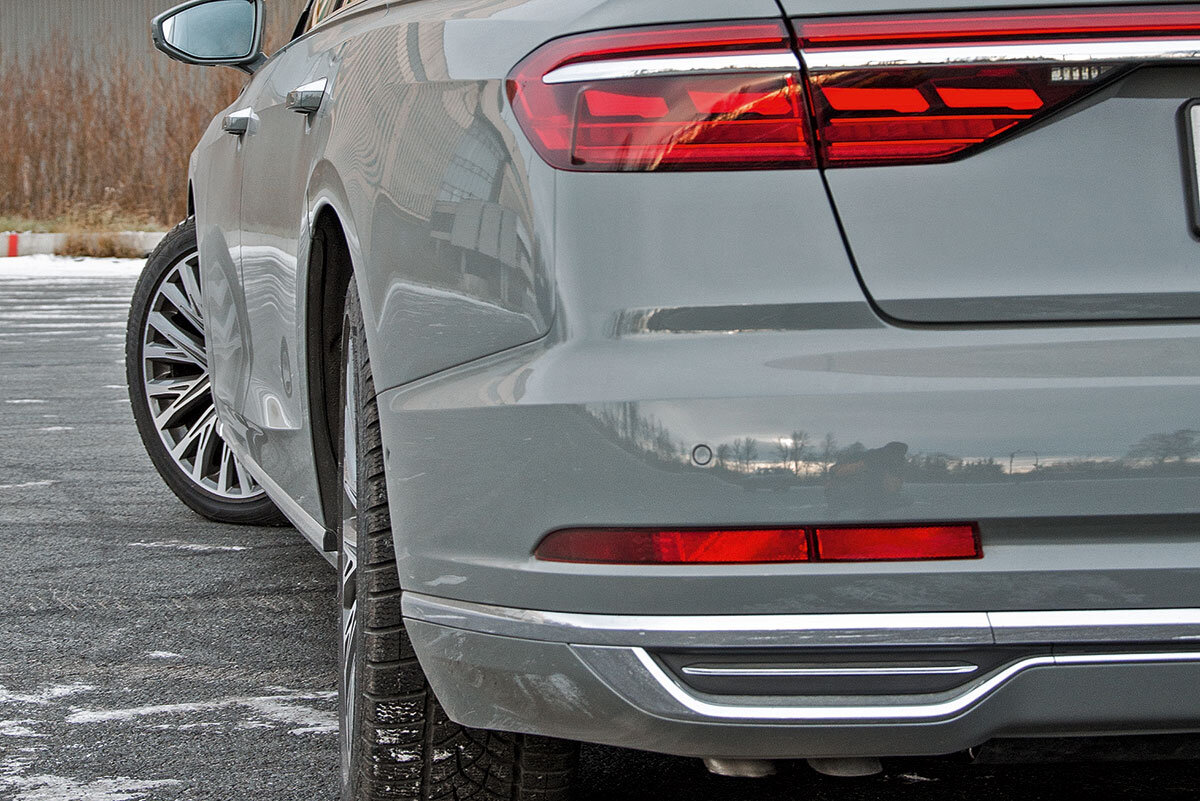 Задняя ось A8 управляемая. На малой скорости она поворачивается в противофазе, на большой — в фазе с передними управляемыми колесами.