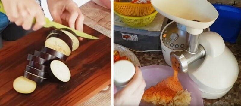 Содержание Баклажаны на зиму с болгарским перцем и чесноком – нереально вкусный рецепт Начну, пожалуй, с простого. Запастись на зиму такими баклажанами достаточно легко, рецепт быстрый и очень вкусный. Как известно, синенькие очень любят чеснок и сладкий перец. Именно эти «соседи» и будут составлять им компанию в банках. Ингредиенты на 5 л: Как приготовить: 1.Помойте овощи. У баклажанов отрежьте кончики, у перца выньте семенную коробку. Очистите чеснок от шелухи. 2.Нарежьте синенькие кружочками, толщиной около 1,5-2 см (не тонко). Сложите в кастрюлю, пересыпая солью, и дайте постоять минут 20, чтобы вышел сок и горечь, если она есть. 3.Через мясорубку (на мелкую решетку) пропустите чеснок, болгарский перец и острый перец. Количество чили берите по своему вкусу, можно вообще не класть, если не любите острую пищу. 4.Сок, который выделится из баклажанов, слейте. Добавьте к кружочкам перемолотую овощную массу. Берите перцы красного цвета, чтобы заливка тоже получилась красивой и яркой.