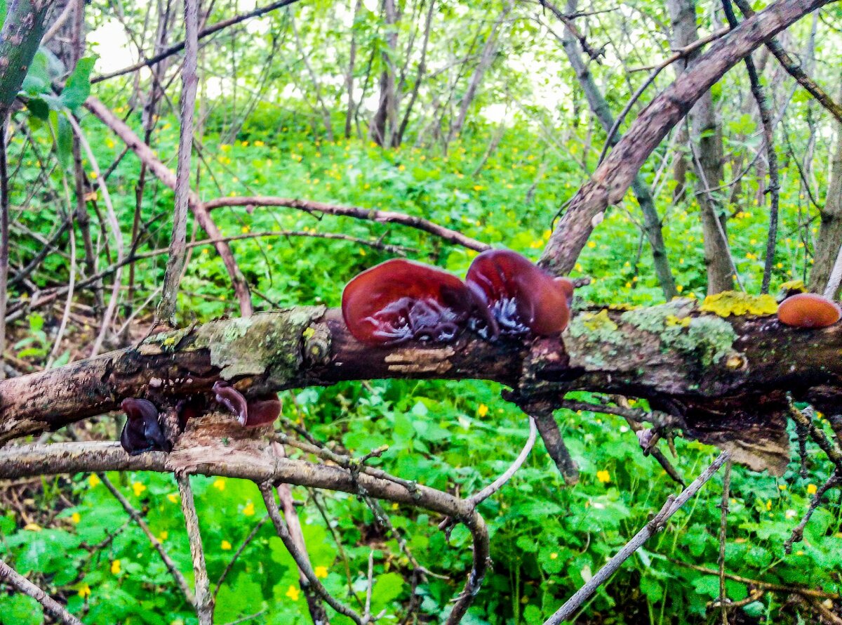 Мы вместе с блогером Александром с канала "Мир прошлого" продолжали идти по по глухой деревне в поисках заброшенных мест. На окраине деревне мы увидели лесок. Решили туда заглянуть. Очень часто такое бывает - раньше была обычная деревенская улица, а потом она просто зарастает и превращается в лес. А если пройти по этому леску, то можно найти много интересных предметов, оставшихся от прежней деревенской жизни. А иногда даже встречаются и заброшенные строения. Вот мы по такому лесу и пошли. Местами заросли были настолько густыми, что нам с Саней приходилось пробираться сквозь дебри буквально напролом. На ветках деревьев нам встретились странные грибы. Я прозвал их "ухогрибы". Уж больно они напоминают уши. А вам так не кажется? И вот, наконец, предмет из прошлой жизни. Старая деревянная лавочка, покрытая мхом. Видно, что она лежит здесь уже много лет. А ведь когда-то на ней сидели, отдыхали. Рядом с этой лавочкой мы увидели груду кирпичей, тоже сильно покрытую мхом. Здесь, скорее всего, с