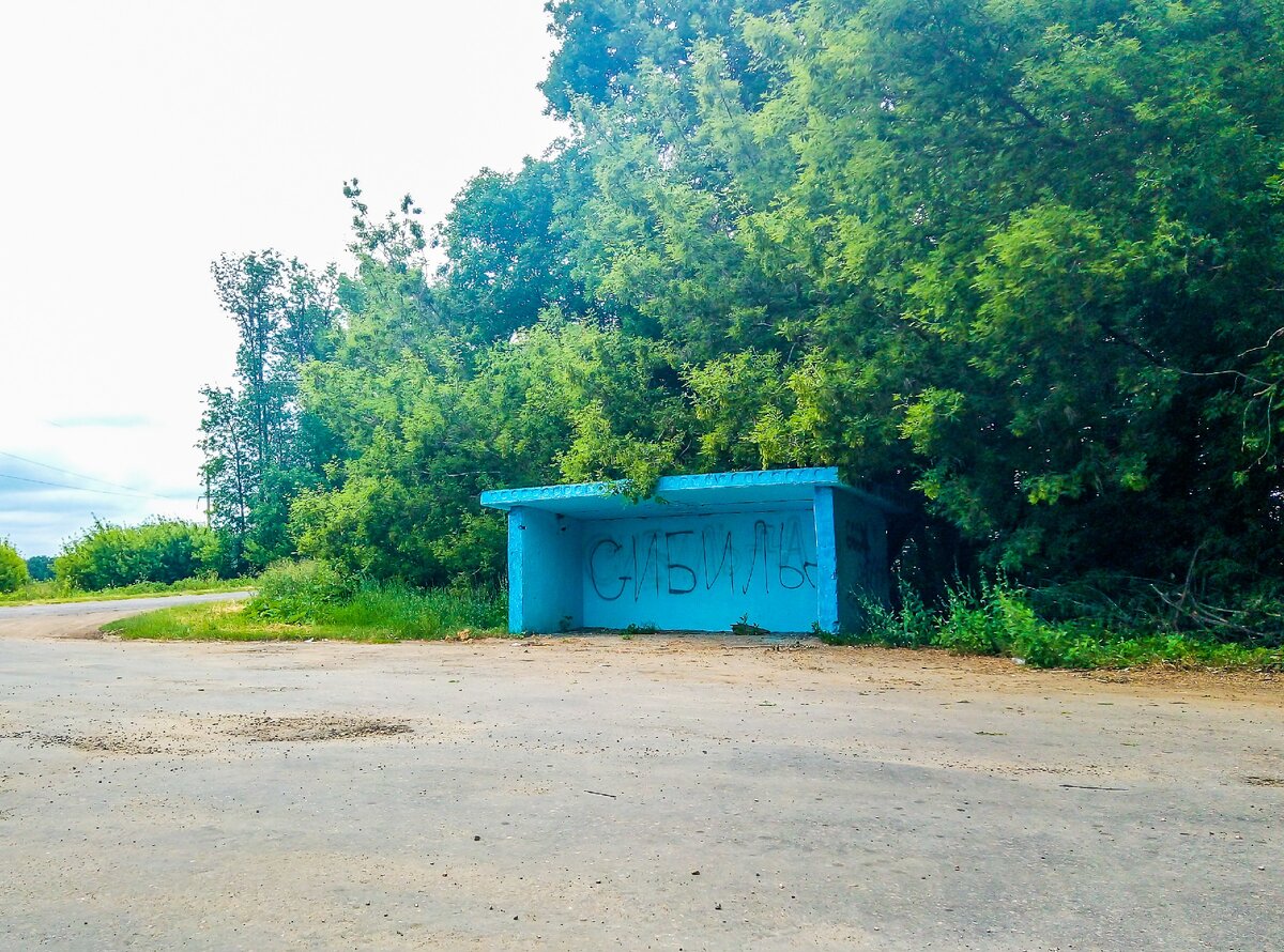 Прямо у поворота на деревню стоит автобусная остановка, на которой краской из баллончика написали название деревни - Сибильда. Да уж, теперь точно не заблудишься. Сразу ясно, что поворачиваешь именно на Сибильду.