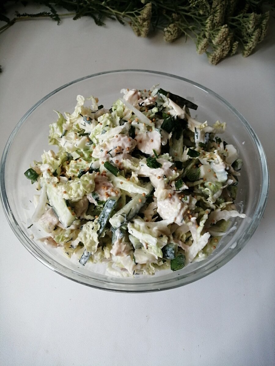 Ну очень вкусный салат с пекинской капустой и крабовыми палочками.