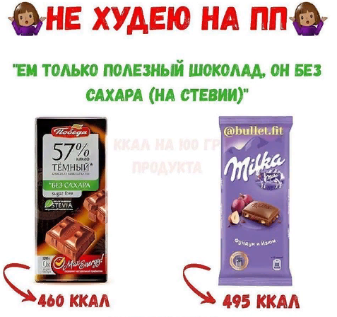 Почему же люди не худеют, если едят «совсем уже очень мало или только полезные продукты»? Смотрите картинку. Она к тому, что и правильными продуктами можно питаться в профицит. ⠀
