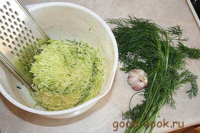 Выделившийся сок слить. Кабачковую стружку немного отжать.