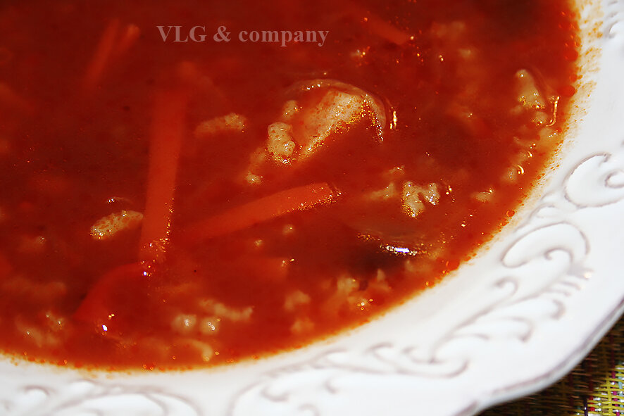 Яркий, горячий (в прямом и переносном смысле), вкусный! И, как видите, приготовление занимает совсем немного времени: у меня ушёл час, ну может чуть больше. А за счет большого количества томатов и добавленной ветчины, запах и привкус баранины ушёл! Считалось, что суп был приготовлен на говяжьем бульоне!)))