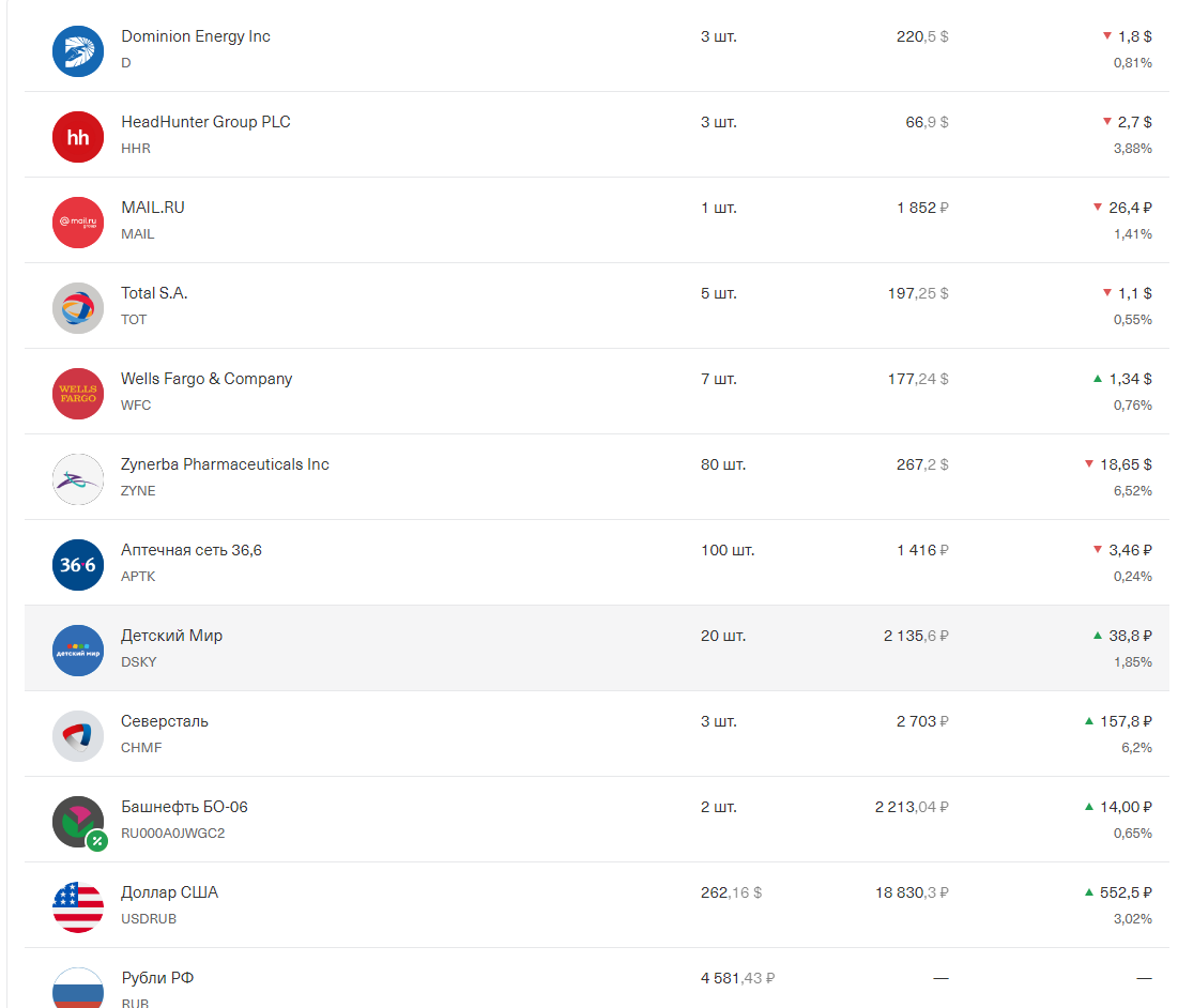 Добрый день! Продолжаю описывать свой личный опыт инвестирования. Предыдущий торговый день был весьма интересен: сначала биржа открылась в плюс, поэтому я продал часть позиций, зафиксировав прибыль, но к вечеру началось падение, так что в итоге заработал я не очень много. На данный момент на моем депозите следующая сумма: 100 465 рублей. и мой портфель выглядит следующим образом: Как видно со скрина, я зафиксировал часть прибыли по HeadHunter продав 2 акции, Mail.ru - купив одну и продав 2 акции, Uber - сработал стоп-лосс на уровне 32,5 и Anheuser. Кроме того, я докупил акции Zyne для усреднения, но она пока продолжает падать, будем ждать рост. 8 июля у Детского мира отсечка по дивидендам, поэтому взял 20 акции для их получения, также прикупил акции аптек 36.6, по прогнозам должны вырасти. Из зарубежных акций еще мною куплена сырьевая компания Total S.A, банк Well Fargo, долью которого владеет Трамп, и энергетическая компания Dominion Energy. В целом все, буду ждать открытия биржи,