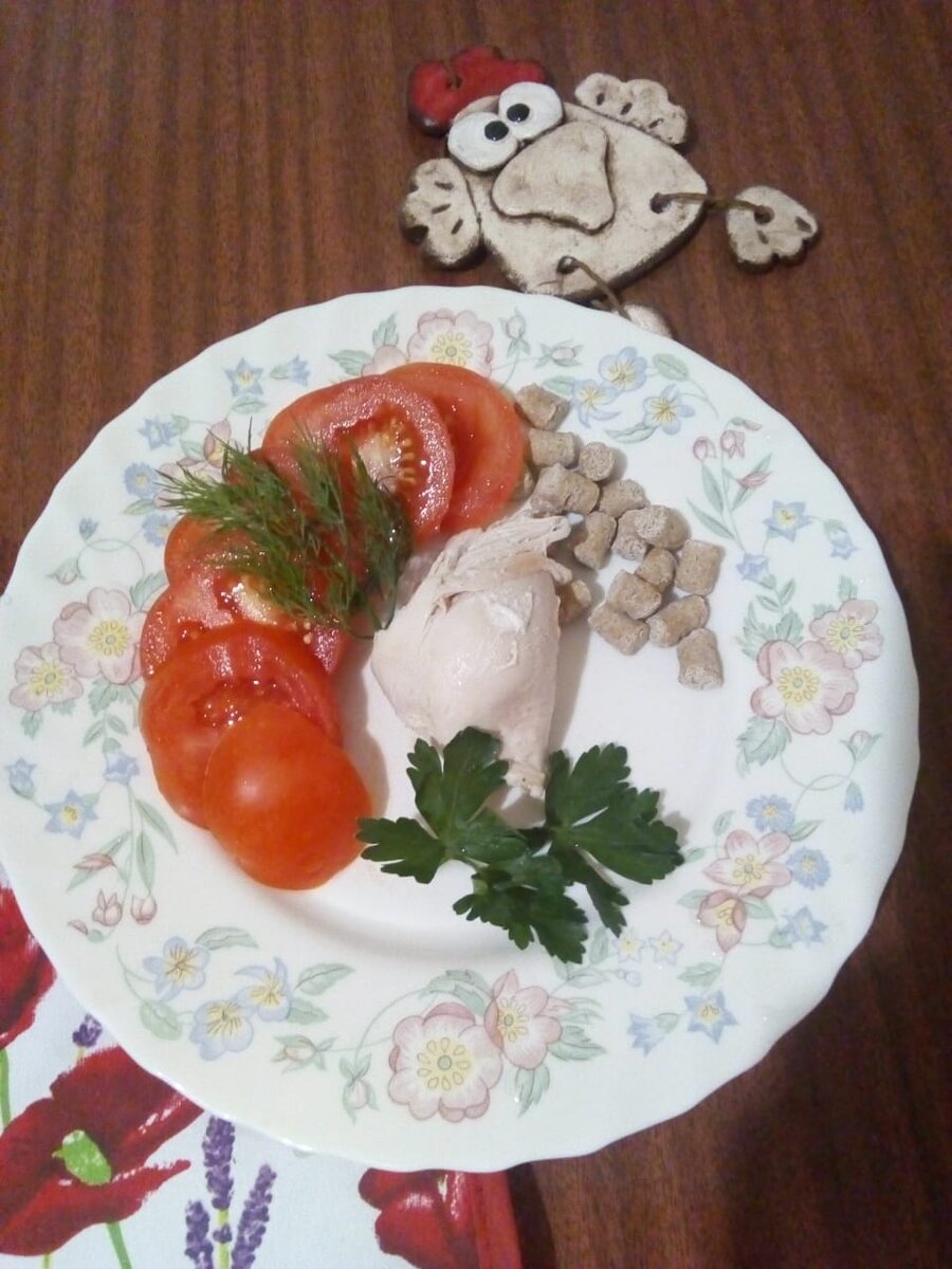 Этот последний приём пищи и представлен на фото. Это всего лишь отварная грудка 80 гр и помидор 130 гр с горсточкой овсяных отрубей.